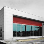 国道8号線に面したこの物件。赤が目を引くおしゃれな建物です。