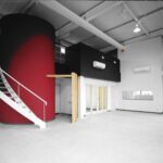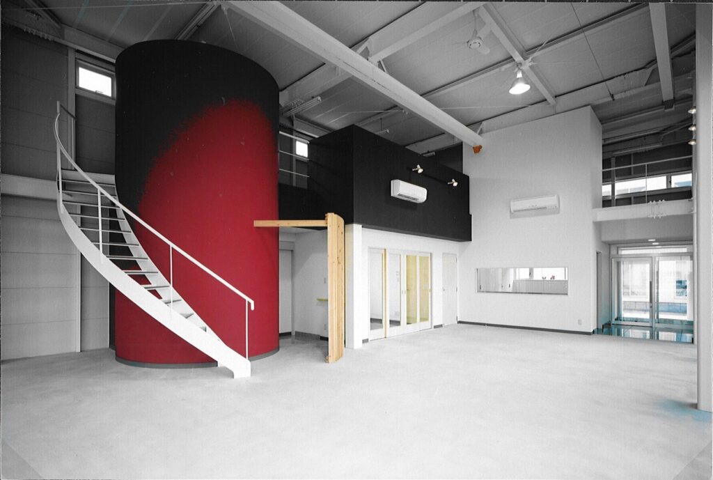 ショールーム内も大きな赤い柱のアクセントがあり、それに巻き付くような白い階段がおしゃれ。