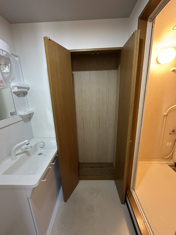 脱衣場にも収納がついています